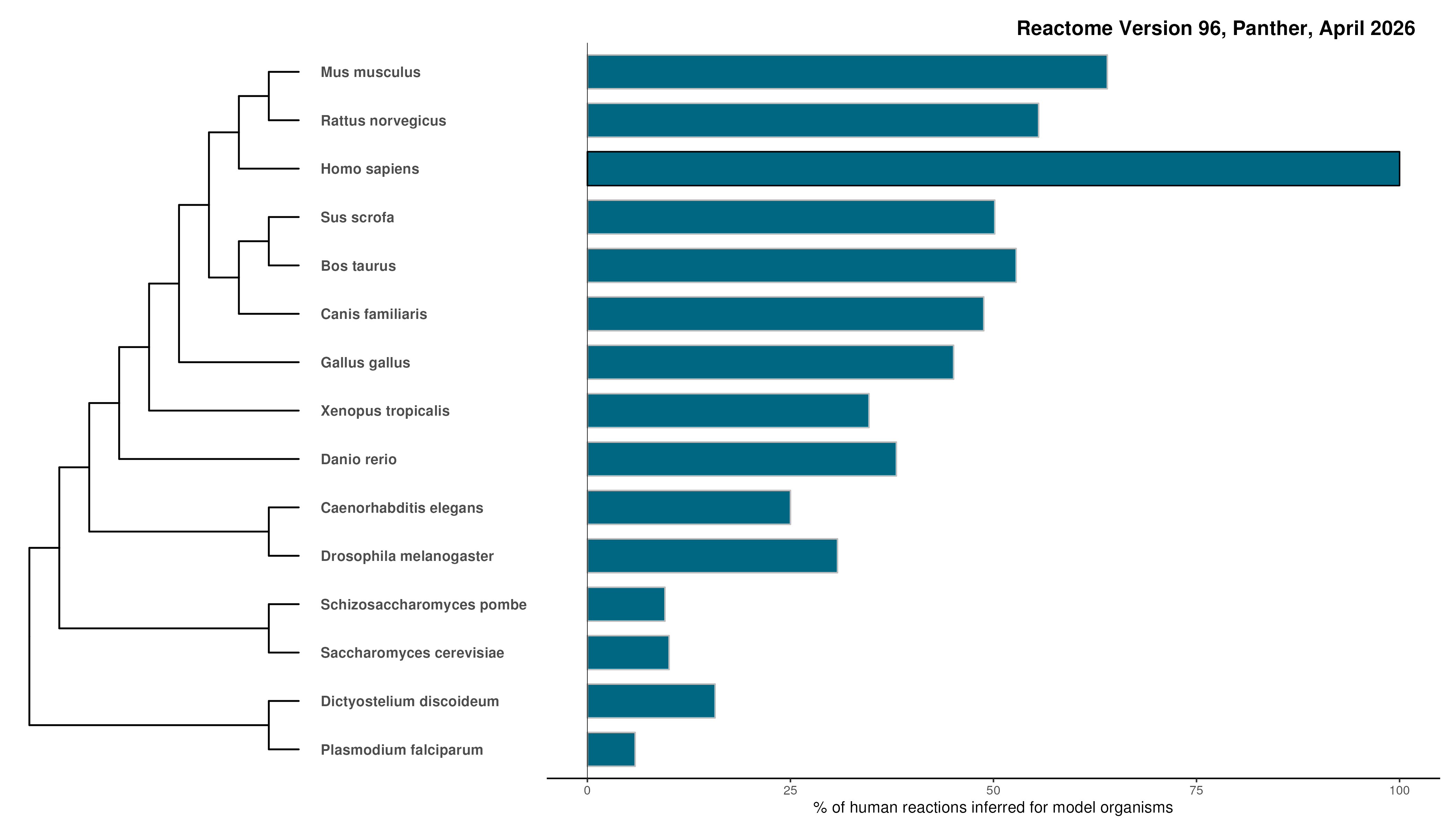 - All human reactions in the Reactome knowledgebase involving one or more proteins are eligible for electronic inference, with two exceptions. Reactions that were themselves inferred based on data from the model organism, and reactions involving species in addition to human (e.g., HIV infection of human cells) are excluded from electronic inference. Eligible reactions are checked to determine whether each involved protein has at least one homologous protein (HP) in the reaction's input, output and (if present) catalyst in the organism undergoing inference. If a human reaction involves a complex, at least 75% of the accessioned protein components of the human complex must have HPs in the model organism.